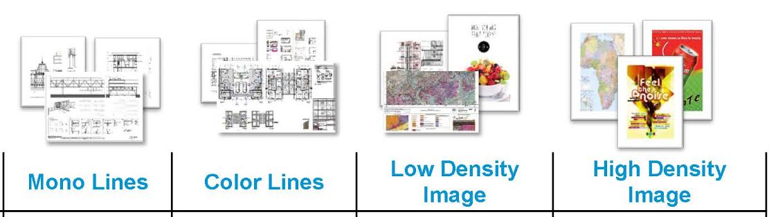 This change in technology for the AEC community, has also lead to a potentially major change in commercial digital printing prices as well. No longer will prices be based on color or black and white ink. Color prices will now be much closer to that of black and white printing, and instead, the price of the print will now depend on what amount of ink coverage your print has regardless if it is color or black and white. The image below shows the different coverage types and how the price would increase as density increases.